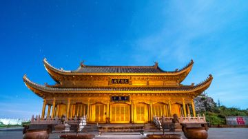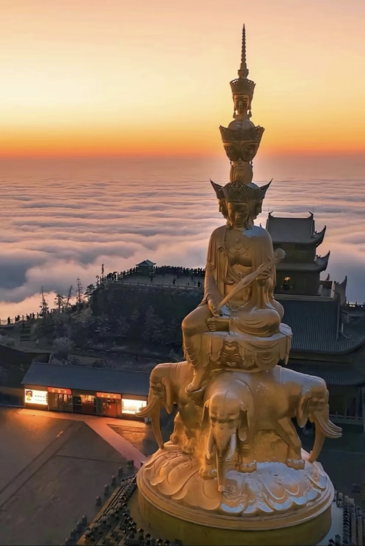 從雷洞坪停車場步行至接引殿乘坐索道(往返120元/人自理)登至峨眉山主峯—金頂(海拔3077)在觀景平臺觀雲海、佛光 [視天氣情況] 等自然奇觀以及金銀銅殿、十方普賢等,在朝拜中心許願。金頂是峨眉山寺廟和景點集中的地方,名勝雲集,爲峨眉山精華所在,高26米總面積1614平方米的金頂及金銀銅殿各一座。